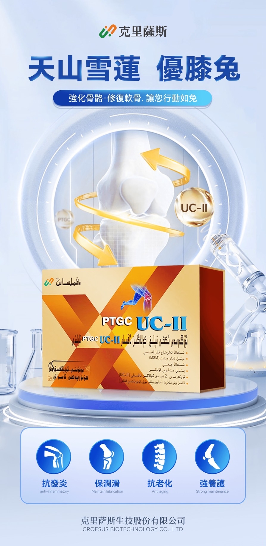 新疆天山雪蓮、甲基硫醯基甲烷(MSM)、新疆沙棘、綠貽貝、非變形二型膠原蛋白(UC-II)、鯊魚軟骨素粉、蛋白聚糖(來自鮭魚鼻軟骨)、葡萄糖胺、橄欖葉、日本碳酸鈣、紅薑黃、鳳梨酵素。